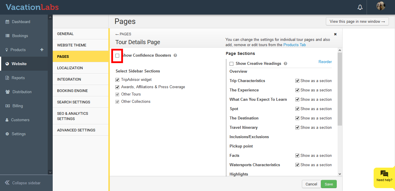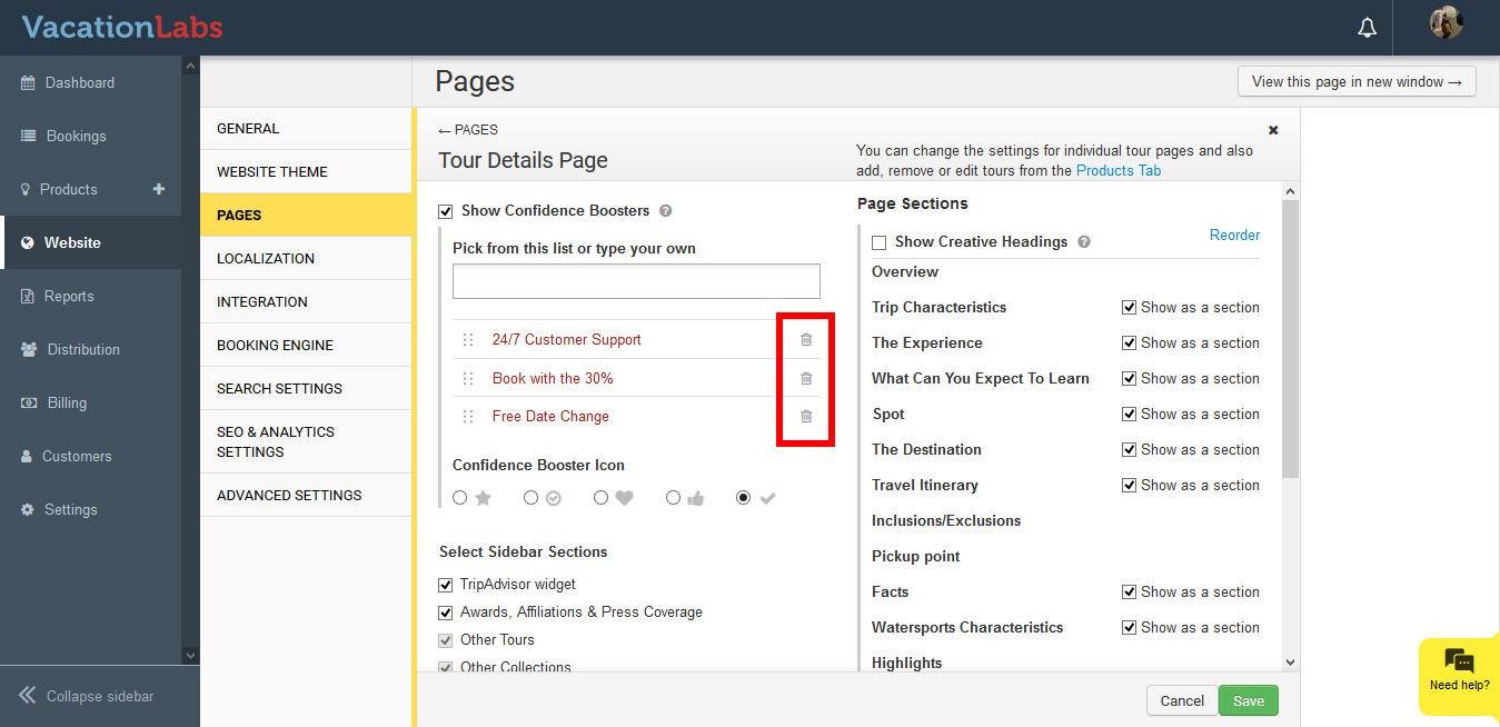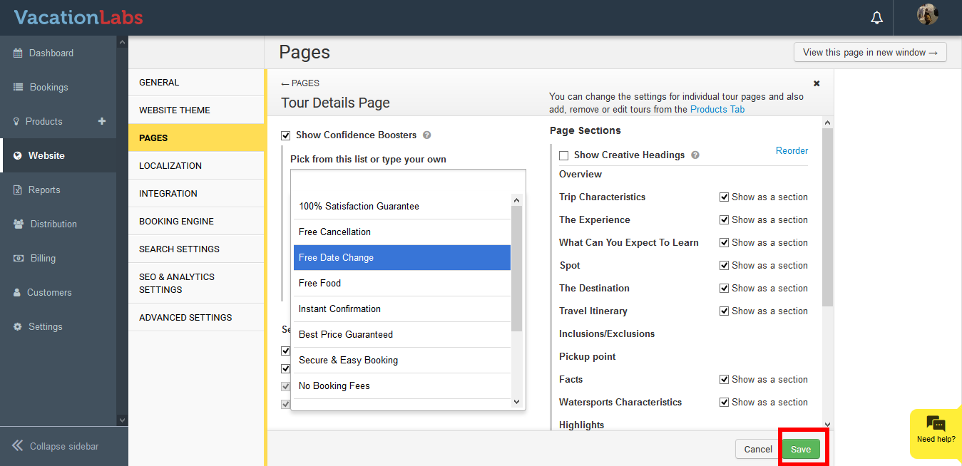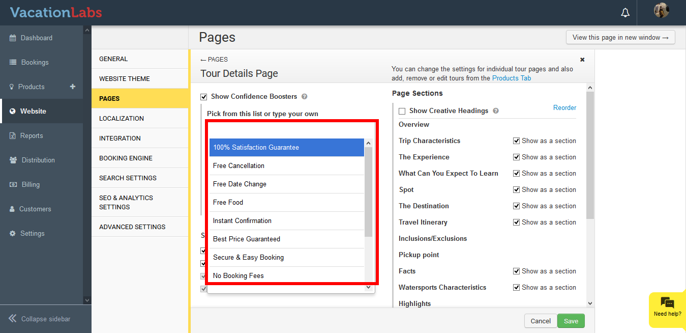 Confidence boosters are small phrases that can be shown to your customers when they are on the product page, just below the Call to Action(Book Now/Enquire Now) button. You can select from the predefined phrases or also add your own phrases.