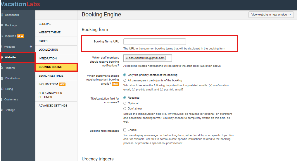 Within the Website menu, select Booking Engine. This will open the configuration settings for your booking engine.