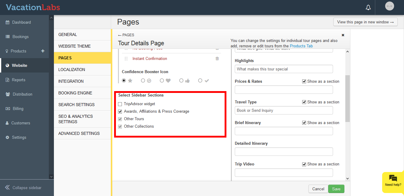Please Note: You are only allowed to check/uncheck TripAdvisor widget, Awards, Affiliations & Press Coverage. To keep your visitor’s engaged on website and explore more tours, collections simultaneously we don’t allow to remove Tours and Collections from sidebar
