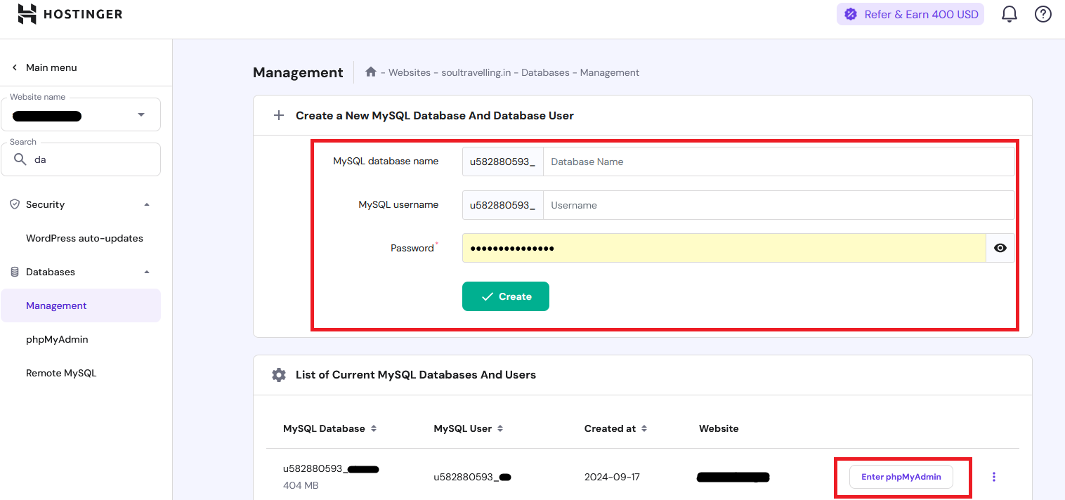 Open Hostinger and navigate to Website > Dashboard. Click on Database, locate your database, and enter phpMyAdmin. If the database is not created, please create a new database.