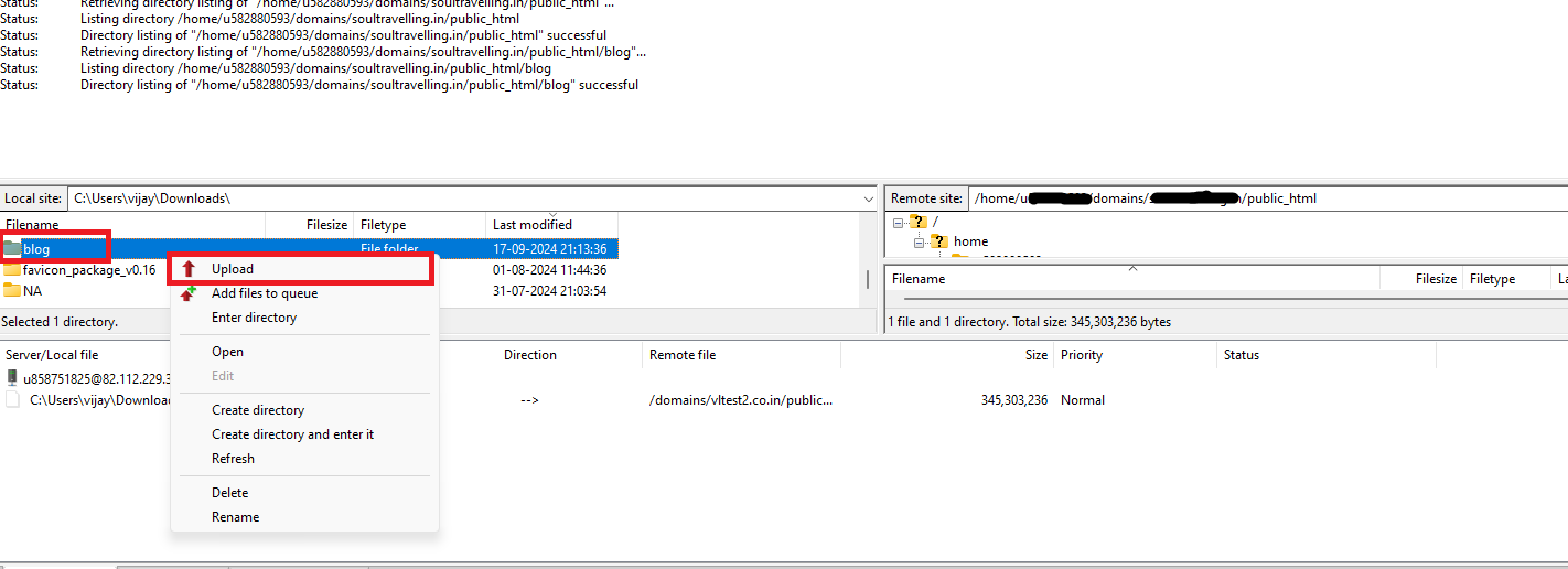 After connecting via SFTP, navigate to the public_html directory under the Remote site: home > uXXXXXXXXX/domains/yourdomain.com/public_htm****l. In the Local site, locate the backup file and find the blog folder. Right-click on the blog folder and select Upload.