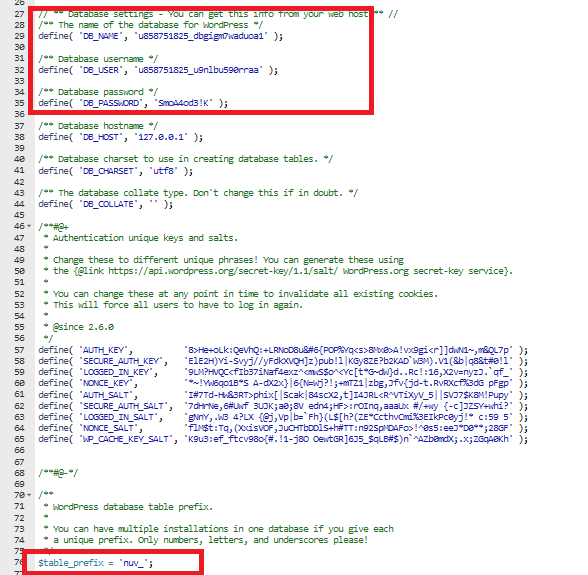 After importing the files and database, you need to match the database credentials to the WordPress installation. To do this, open Hostinger and go to Website > Dashboard > File Manager to access the files. Navigate to public_html > Blog > wp-config.php and update the database name, database username, database password and table prefix (please check the database for the prefix used).