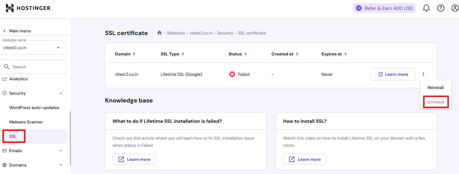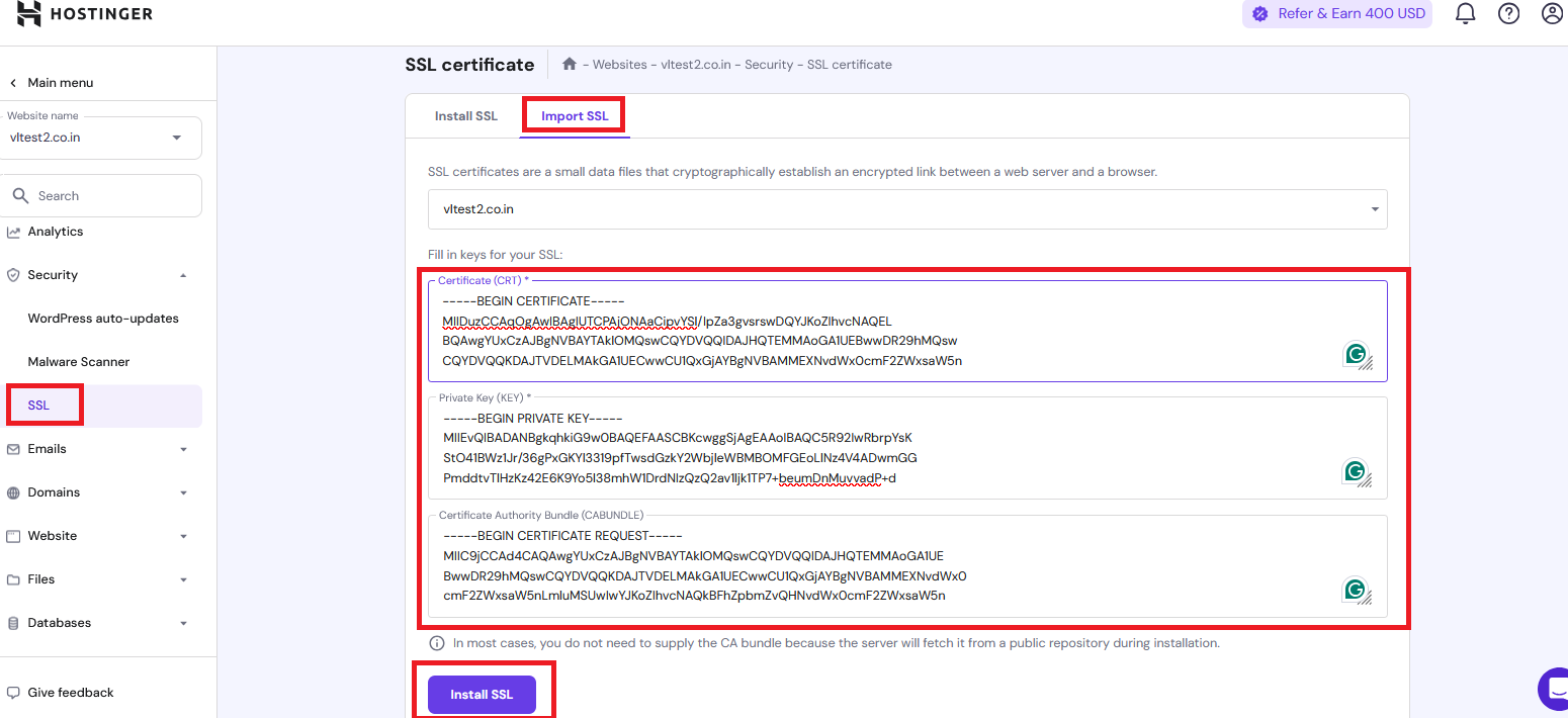 Once you have generated all the files, open each one in Notepad, copy the contents, and then navigate to Hostinger’s dashboard. Select Website > Dashboard, and from the menu, go to Security > SSL. If there is an already installed SSL that is in a failed status, uninstall that SSL.