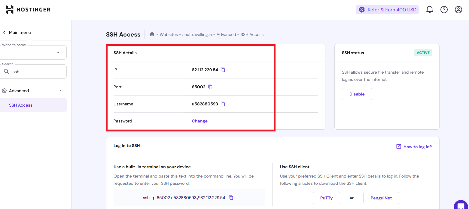 Open Hostinger and navigate to Website > Dashboard. Search for SSH and select SSH Access. The SSH credentials will be displayed, and you can use these to connect to the file manager in Hostinger.