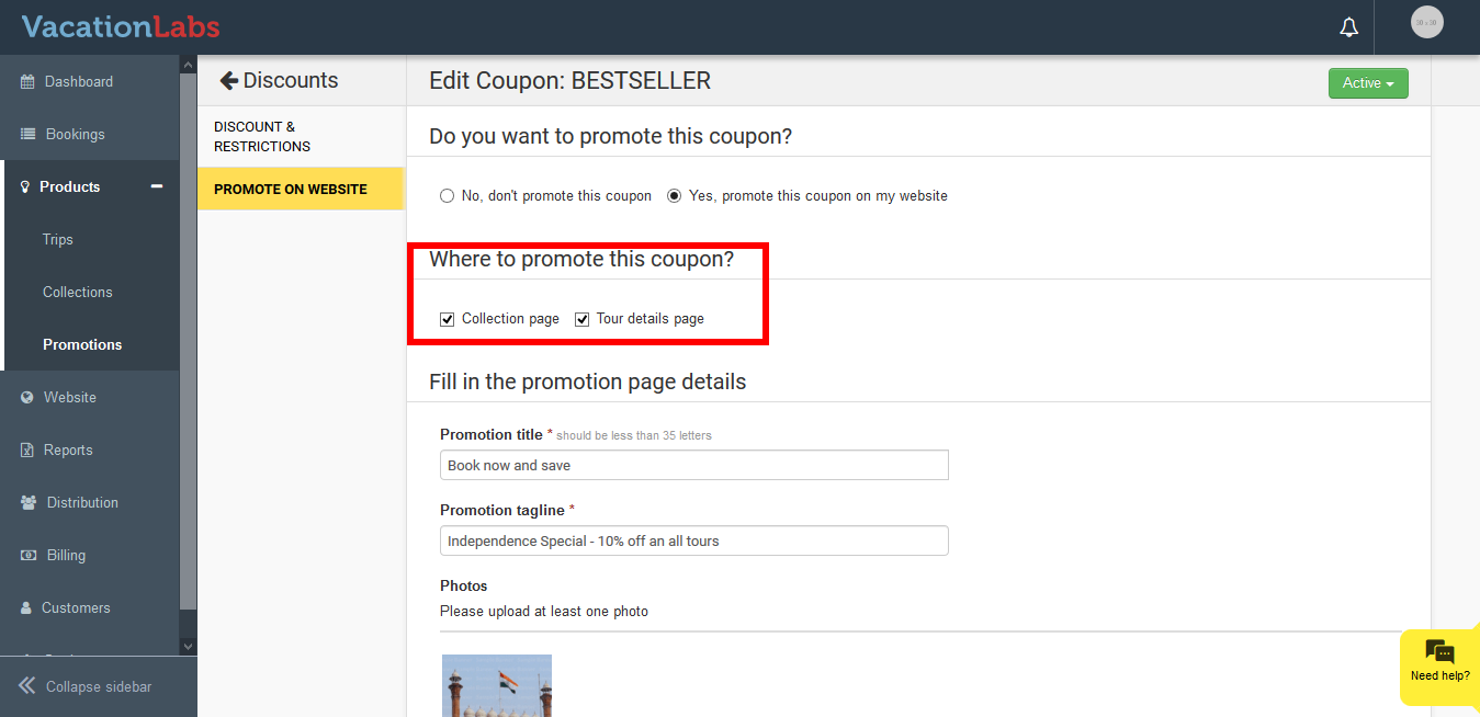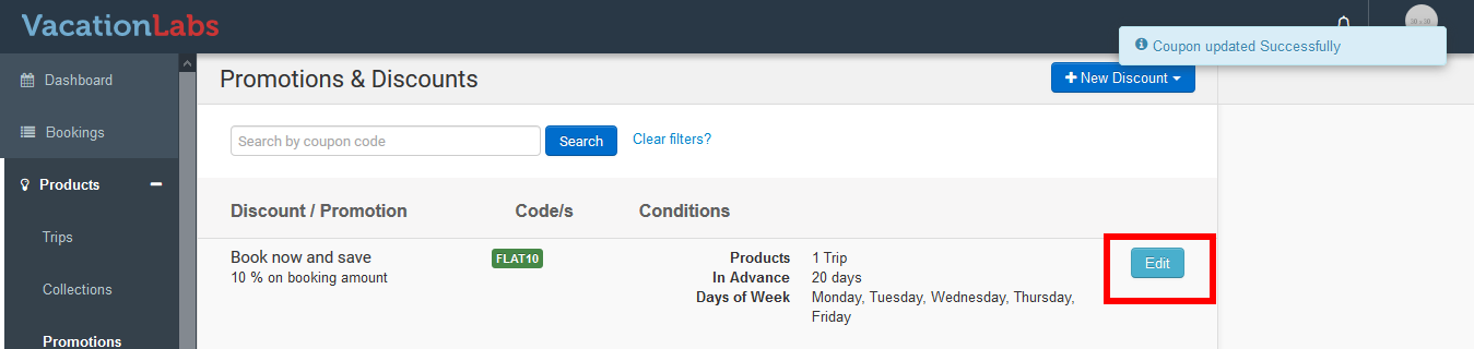 Once the coupons are created you might also like to display the coupons on your website. This will help your website visitors know about the offers on your website. Before promoting the coupons you will have to create them. We would recommend you to read our article on Creating coupons in Vacation Labs. Please follow the below steps to promote the coupons,