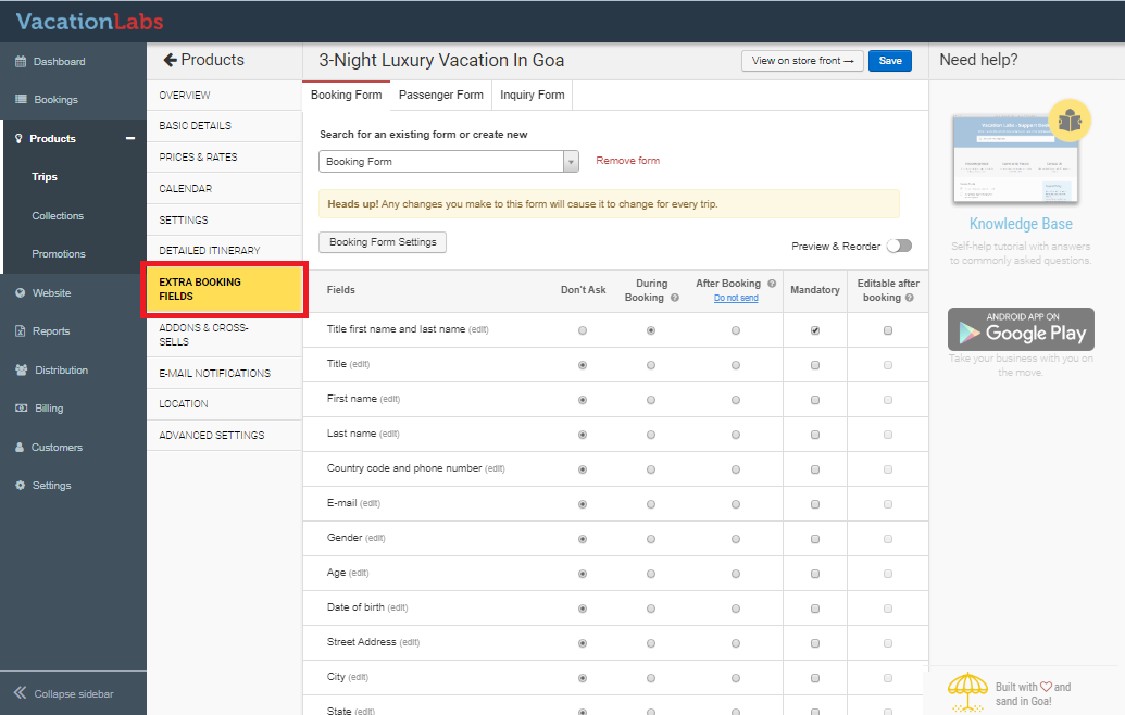 - Within the trip editor, look for the Extra Booking Fields button or tab and click on it. This section controls all custom fields across your forms.