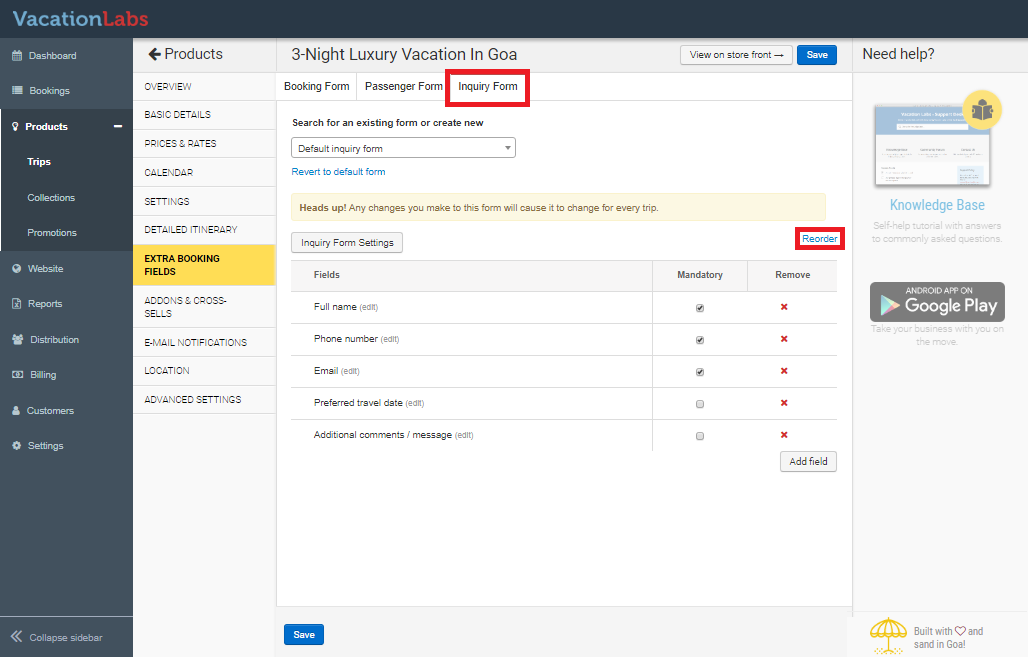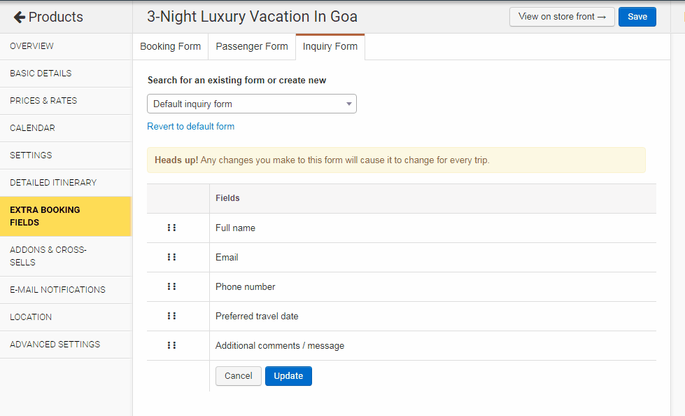 This guide will walk you through the steps to change the display order of fields in your trip’s booking forms. You can manage fields for the main Booking Form, the Passenger Details Form, and the general Inquiry Form from the same location in your Trip editor.