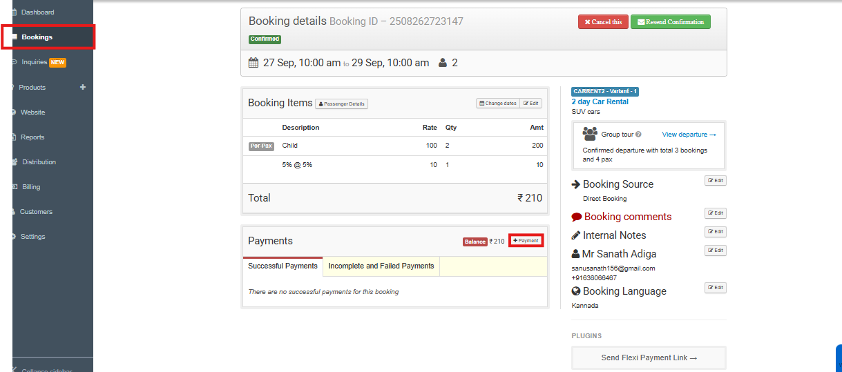 The screenshot below shows the + Payment button within the booking details and the “Collected by Us” payment form for visual reference.