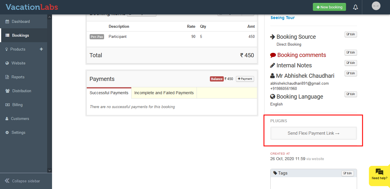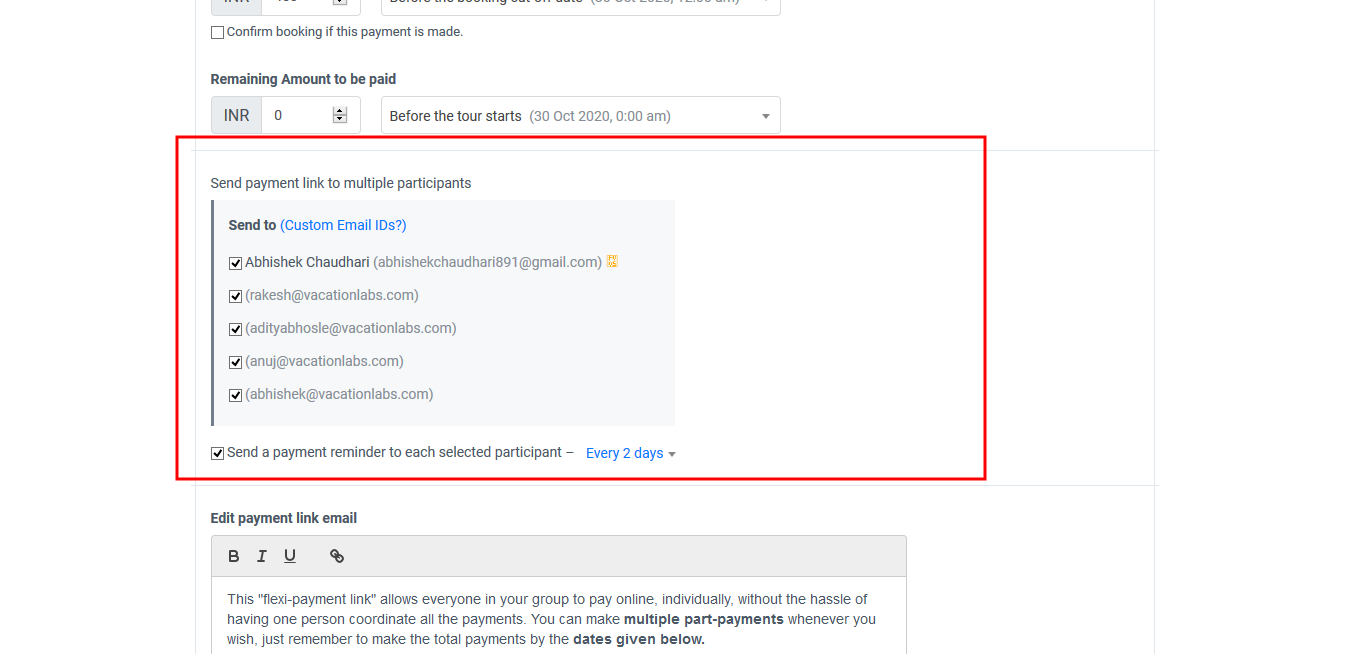 To eliminate this issue Vacation Labs provides you Flexi Payment Plugin. This feature simplifies payment splits and recovery. It is available on request and can be effectively maneuvered through the Vacation Labs booking engine. Payment for a single group booking can be easily split between participants in a manner they like, without you needing to intervene much.