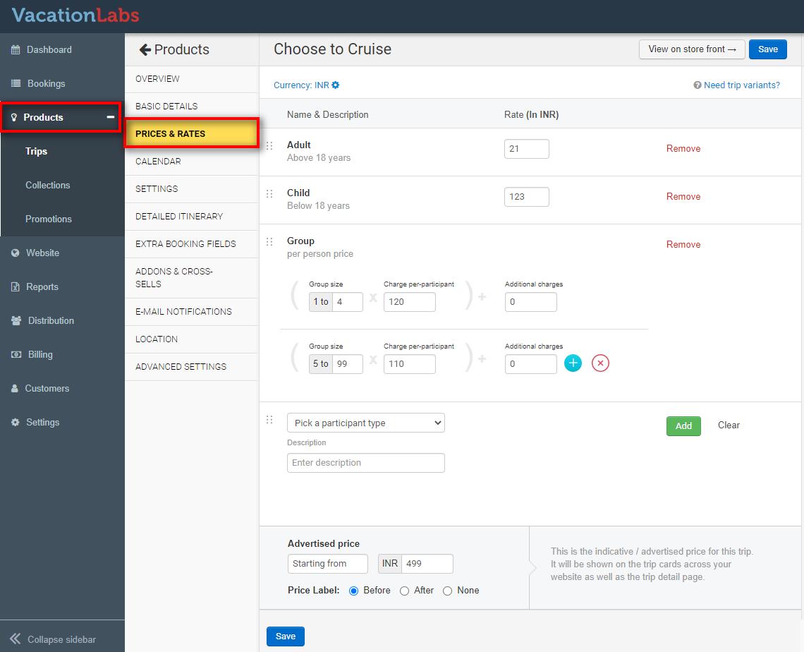 On the other hand the Advertised price is the price that you would like to show on the tour details page, tour cards, collection page, etc to attract customer. For example, if the cost is 500, 1000, 1500 Rs for Child, Adult, Participant respectively, then you can advertise the price as Starting from 500 Rs on your tour details page***.*** This has higher chances that the customer will proceed to checkout.