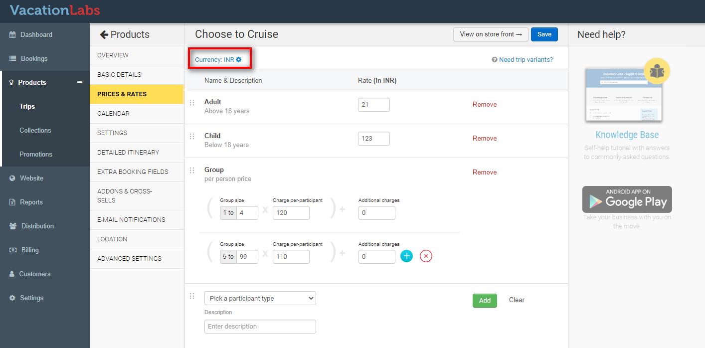 This allows you to change the currency for a particular trip. So you can have one trip in INR whereas others in USD. This helps your customer to make the payment according to their ease.