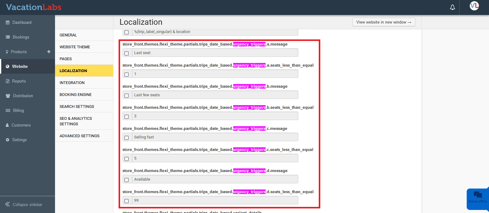To change the default Urgency Trigger messages and the number of seats at which the Urgency Trigger message is displayed, navigate to Website > Localization > Storefront and Booking Flows. Here, press CTRL+F and search for ‘urgency_triggers’.
