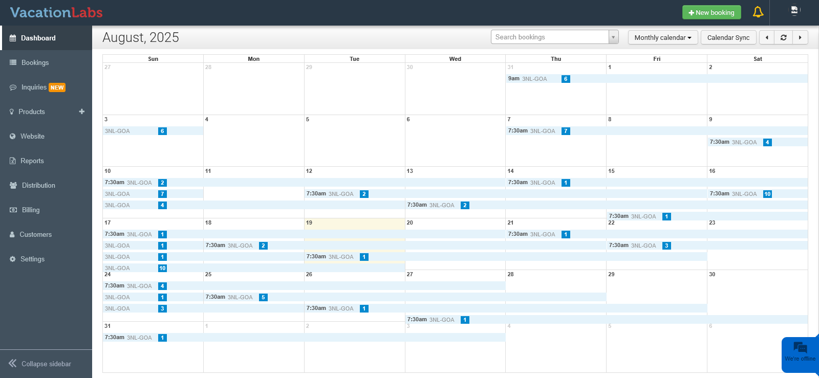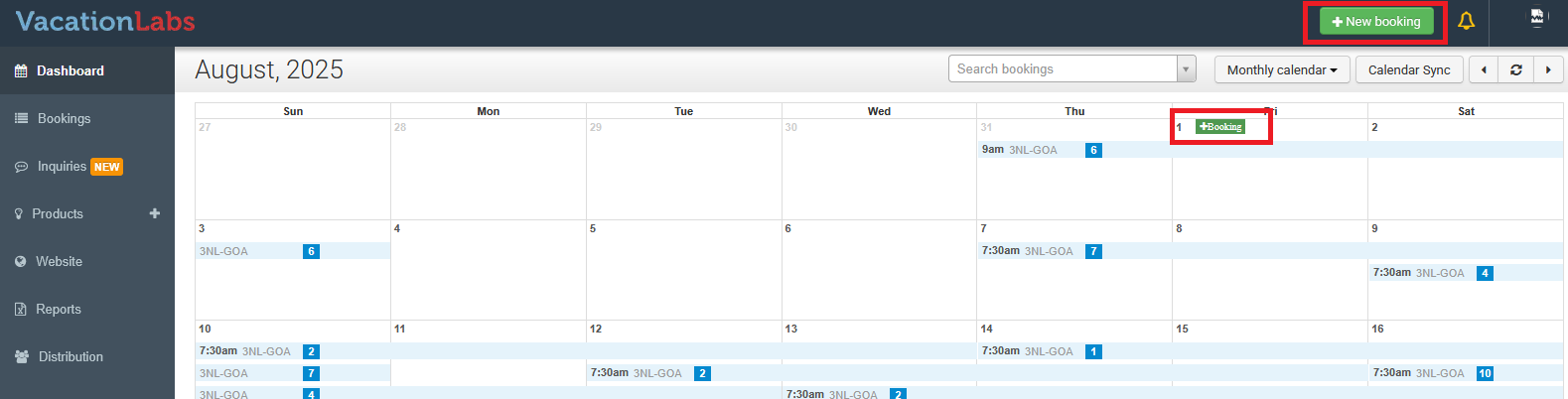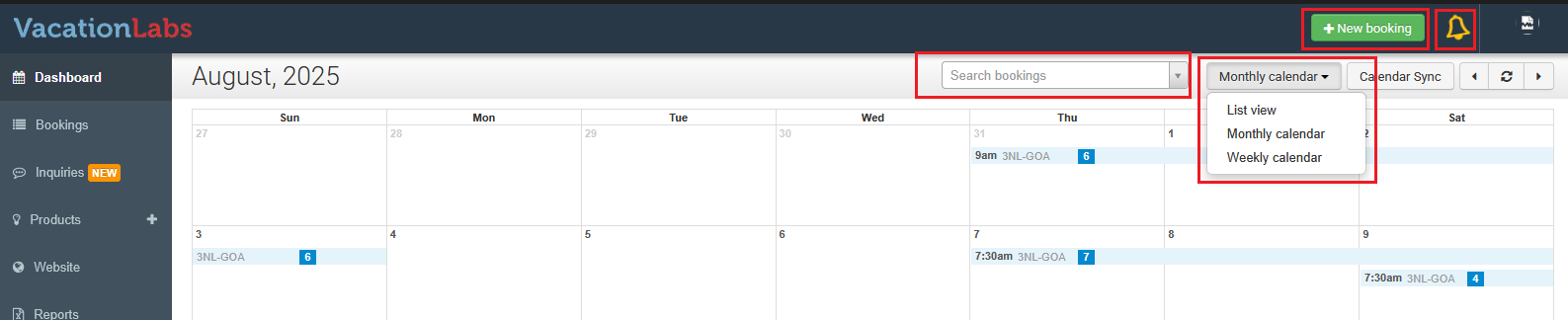 The Dashboard is your home screen in the Vacation Labs booking system. It provides: