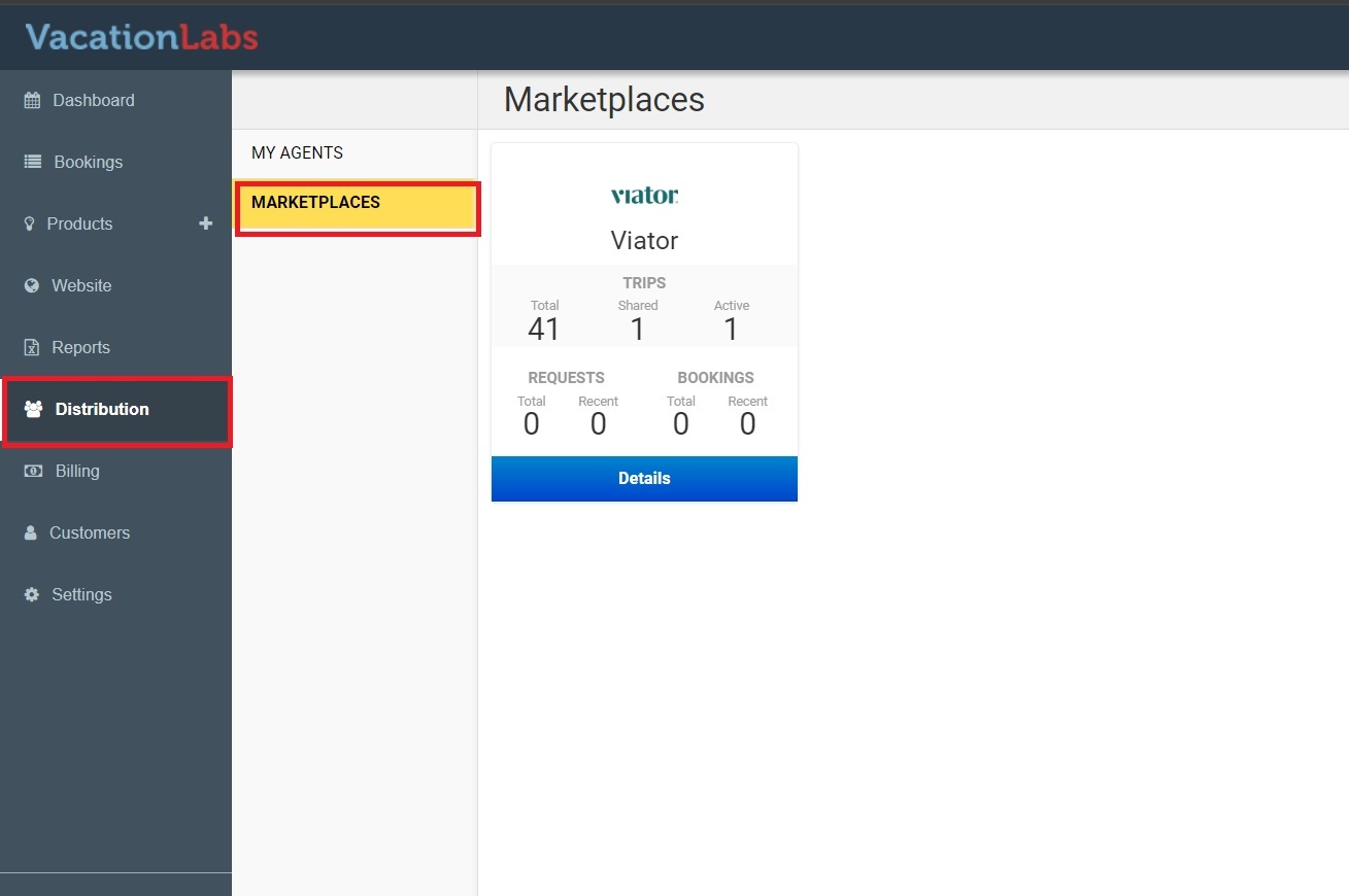 Sign to Vacation Labs and go to Distribution > Marketplaces (refer screenshot below)