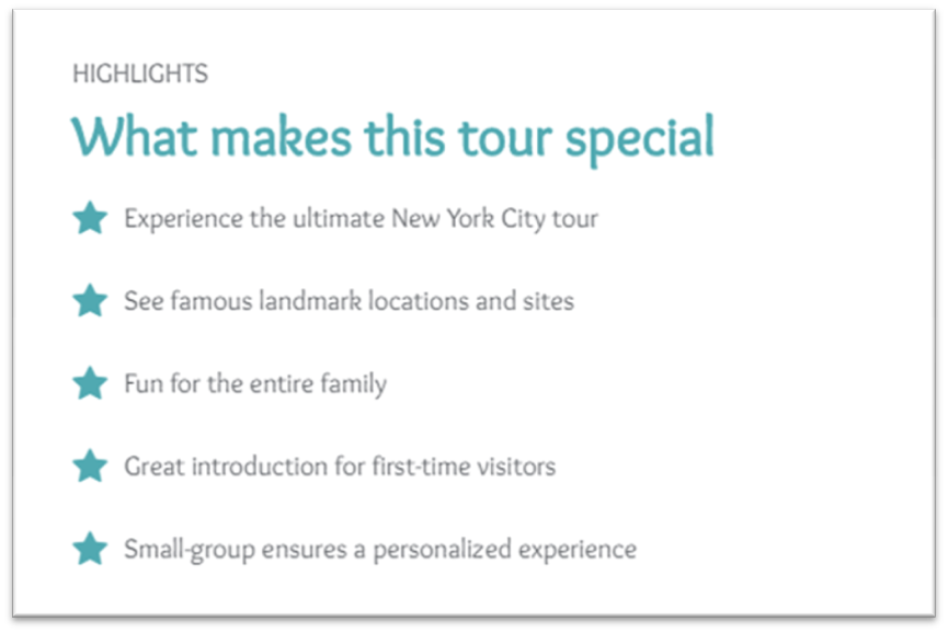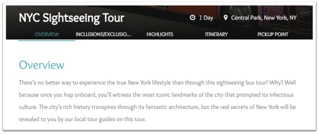 With catchy headlines/ tour names draw visitors into the tours, capture them with a fascinating tour overview. Riddle the overview with most searched and relevant keywords for the target audience to find the website online.