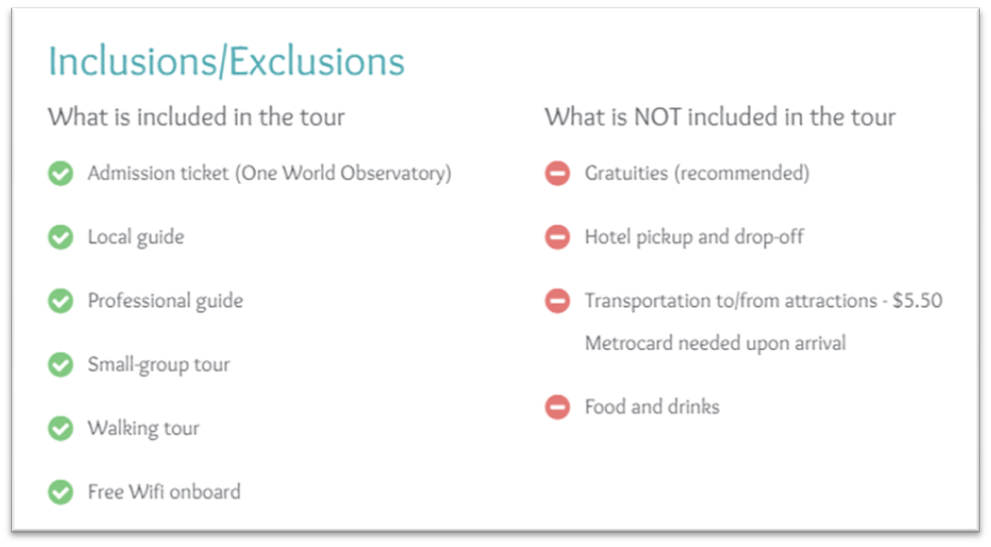 The inclusions, exclusions and highlights offer brief bites of information so visitors are quickly aware of the service on offer.