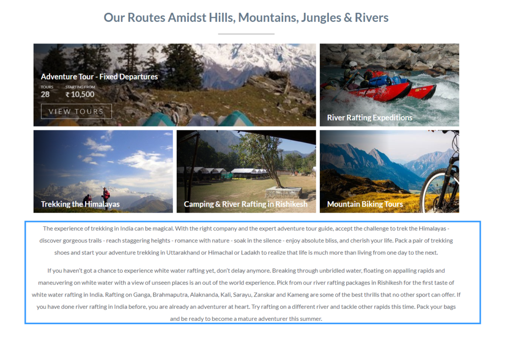 Each category page introduces tours and activities with a banner image and headline (see image above). This is followed by a brief introductory text section. This isn’t your only chance at building your SEO. After the tours listed on the category page, you have the chance to add as many sections of content as you like. One can talk about safety during the tours here, getting the real feel of the location or having a variety to choose from. The type of content and SEO strategy is very flexible.