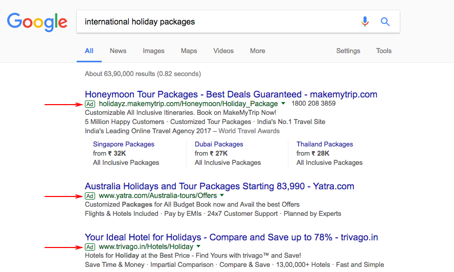 While great SEO for online travel businesses is key to achieving long-term Google search success, it’s often not as simple as you might think. For instance, it’s difficult for new travel websites, or travel websites that are new to SEO best practices, to rank as high as well-established sites that have been optimized for years. And that’s where Google AdWords comes in. Google Adwords displays ads on the top and side of the organic results when users perform a Google search. Though the print is fine, you can see that they are labelled as “Ads.”
