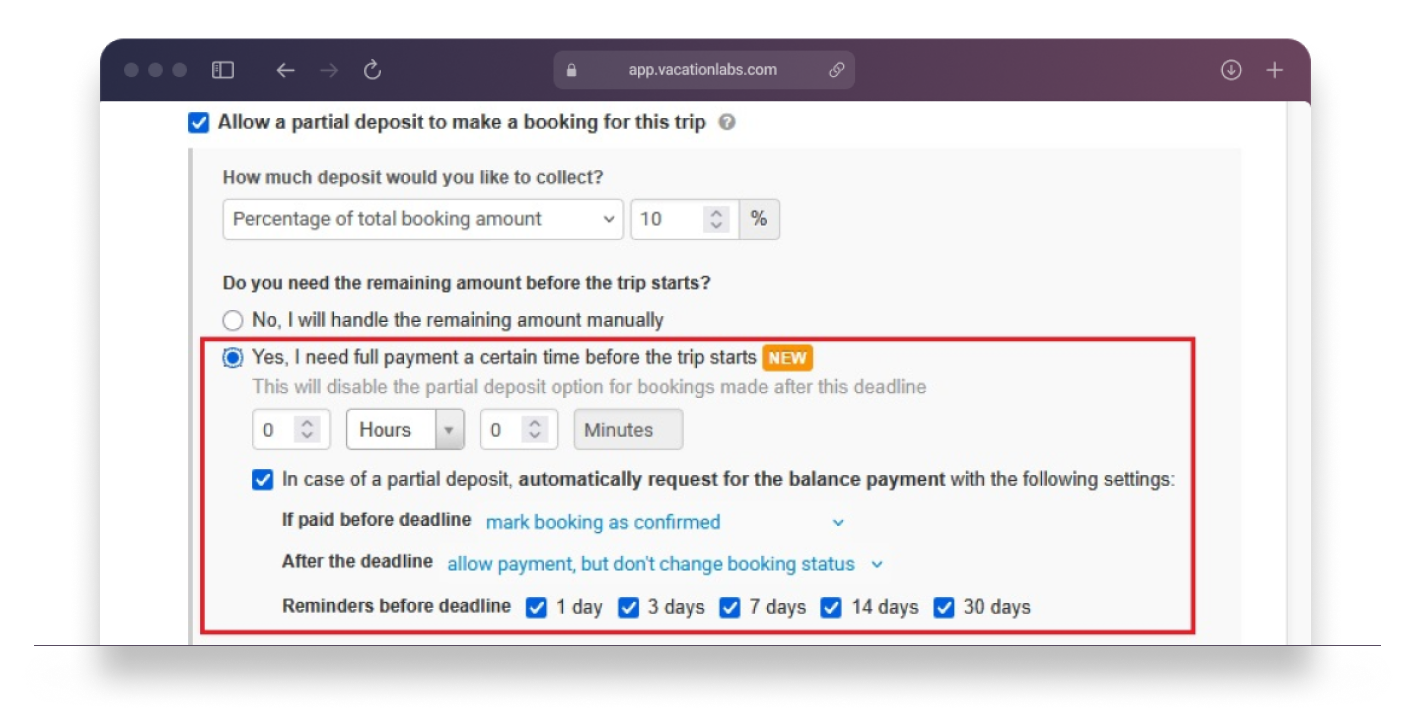 With this new update, the Vacation Labs booking engine can now automatically request the remaining balance from customers who’ve booked using a partial deposit.