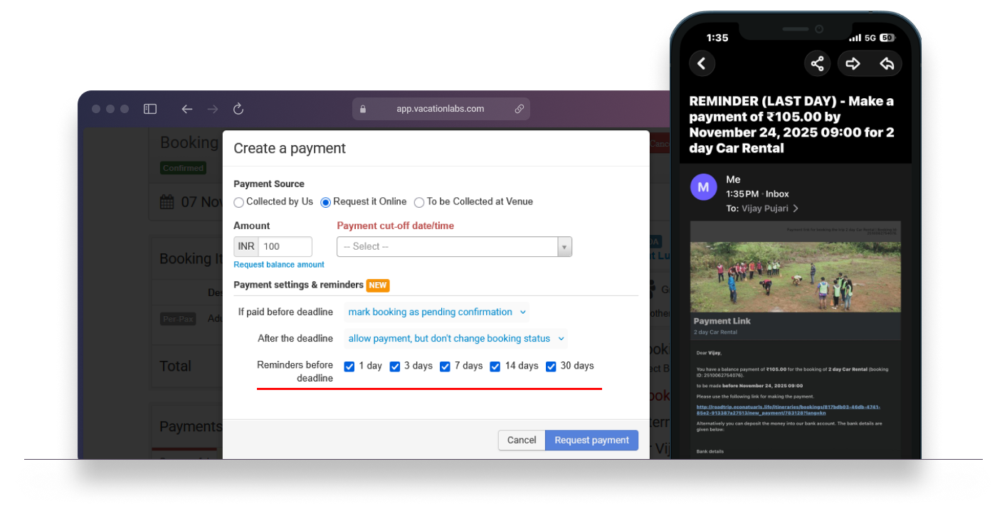 With this new update, the Vacation Labs platform can now automatically send reminder emails to your customers — based on the schedule you define while creating a payment link in the Backoffice.