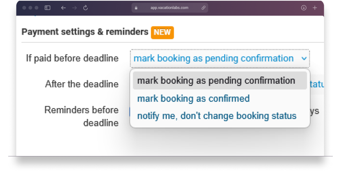 You can now control what happens as each payment link approaches or passes its deadline. The system gives you options to automate booking updates or simply receive notifications, depending on your workflow.