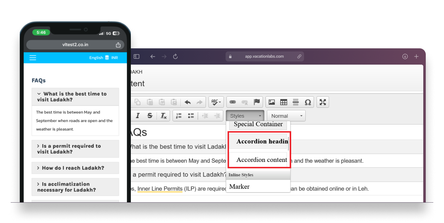 With a recent update to our website builder, you can now add collapsible sections to any rich-text field on your website. These expandable sections, also called accordions, are great for streamlining content, such as FAQs, packing lists, pre-tour checklists, safety guidelines, etc. Just keep in mind to not use these collapsible sections for multi-day itineraries, because we have a dedicated feature for that, which can also build route-maps automatically.