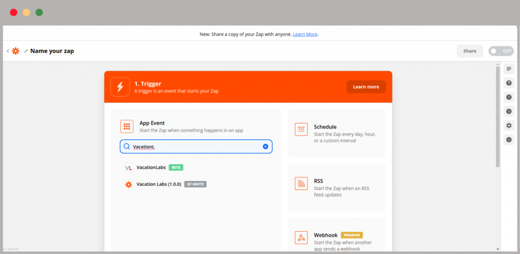 Our integration with Zapier, which was in private mode earlier, is now public. You can find the Vacation Labs’ Zapier application by simply searching in the app list.