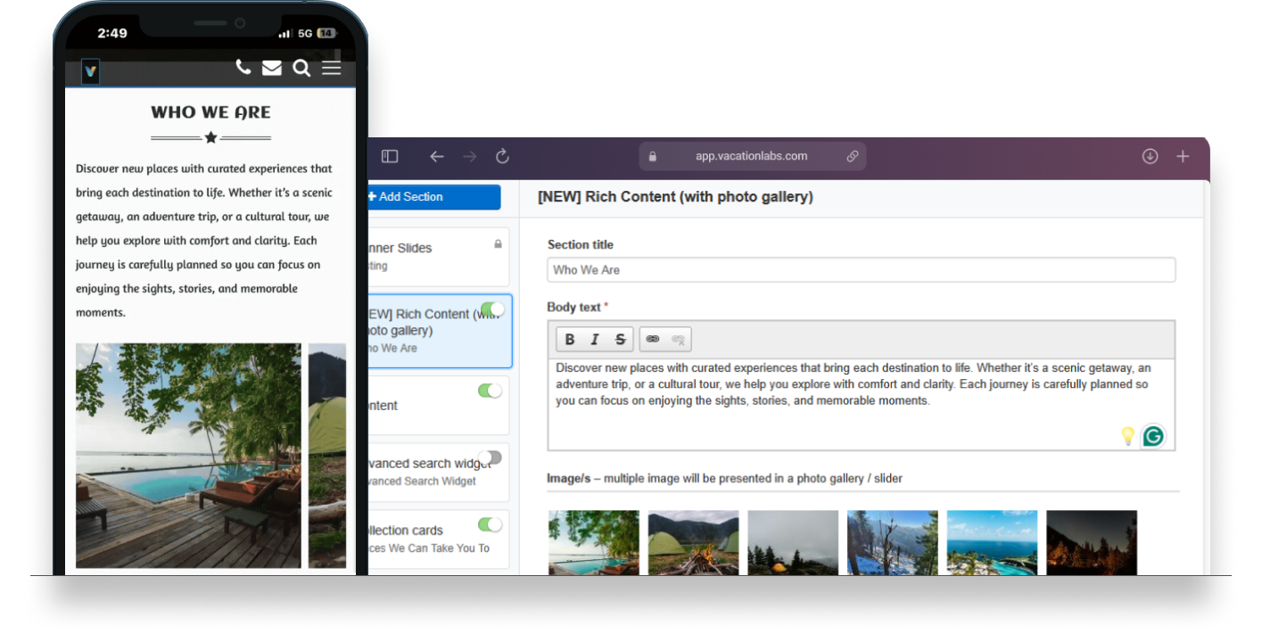 This enhanced section lets you pair your descriptive text with multiple photos presented as a clean, responsive carousel or slider — ideal for visual storytelling across About pages, destination overviews, brand highlights, and more.