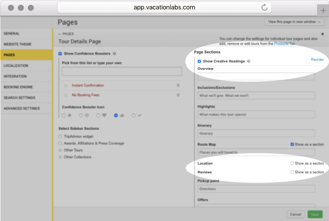 Along with this, we have also added the ability to reorder sections on tour pages. Both these options are accessible from the backoffice: Website > Pages > Tour details page.