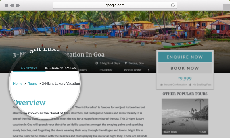 Apart from microformats, which are visible only to search-engines, we’ve also upgraded all our travel website templates to show breadcrumbs that are visible to end-users. This usually helps users in navigating your website easily. It also helps in the discovery of related content. For example, if a user lands directly on the tour page of “Chadar trek” after searching on Google, the breadcrumbs help in discovery of the “Himalayan treks” collection.