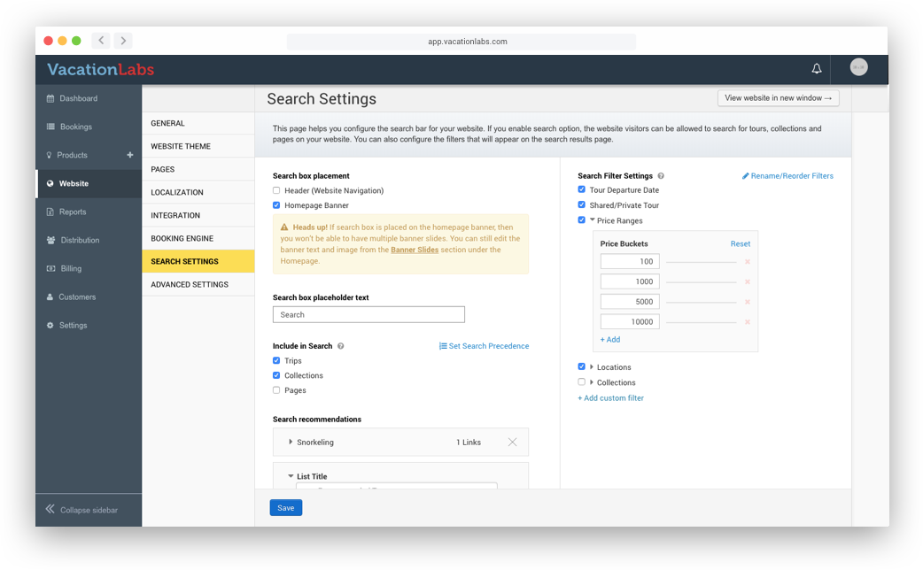 Head over to “Website > Search settings” to take complete control of site-search on your tour website. Using this screen you can: