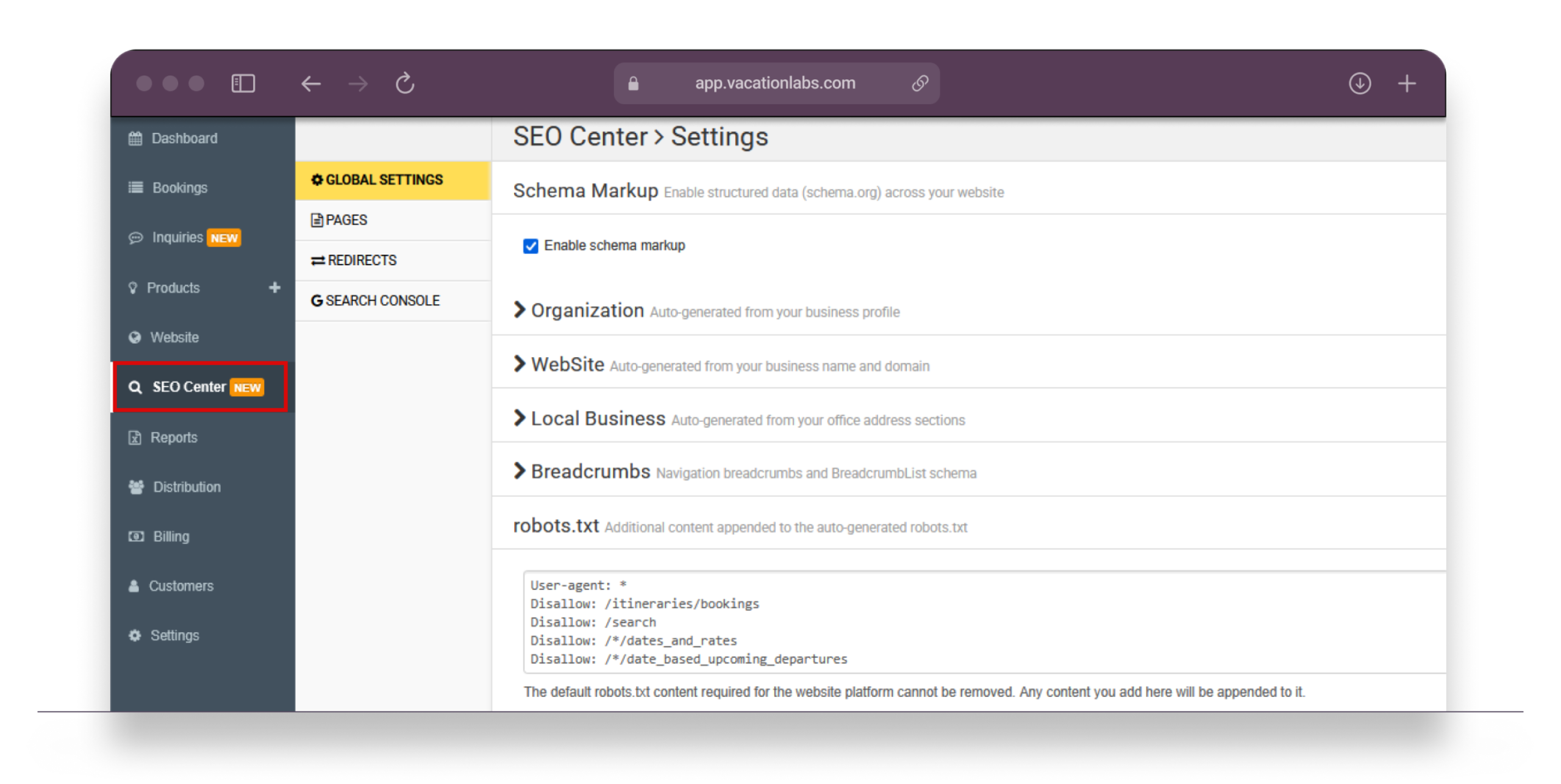 SEO Center includes four sections: Pages (meta tags and schema markup), Redirects (301 redirects), Settings (global schema controls and robots.txt), and Search Console (Google integration). Here’s a quick overview of the key highlights.