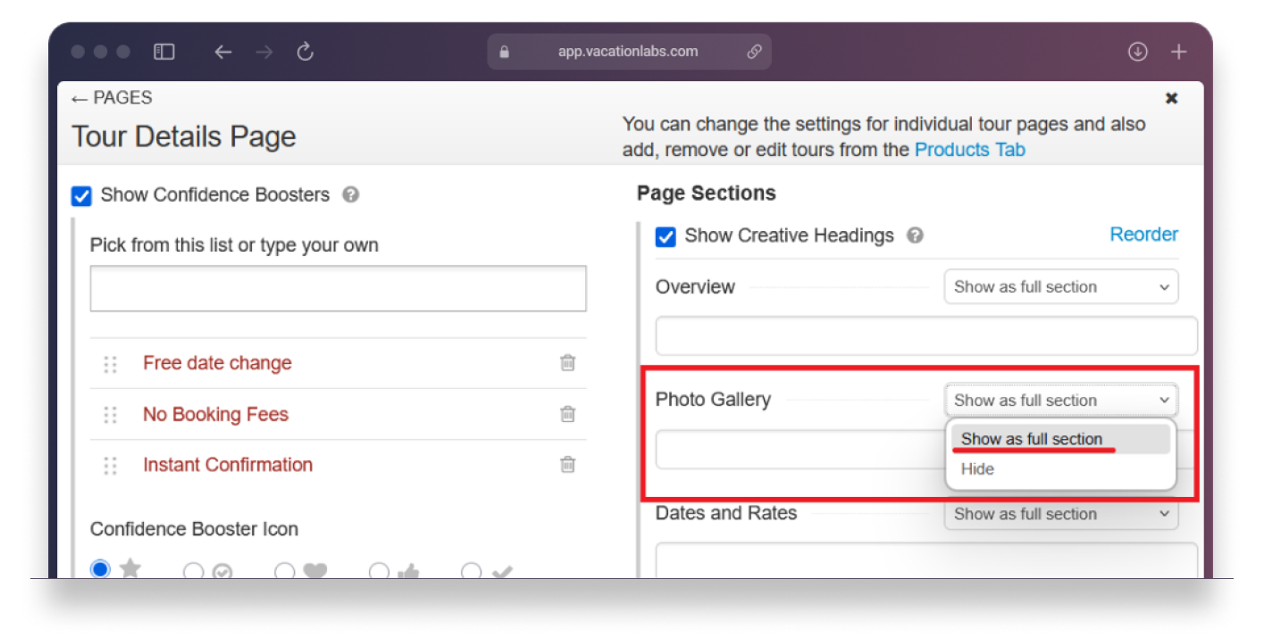 You can now add a Photo Gallery / Slider section directly to your tour pages using our travel website builder. Unlike the existing “Photo Gallery” button (which opens a popover/lightbox), this new section displays your tour photos right in the main content area — helping customers visualize the experience more clearly and increasing the chances they’ll book.